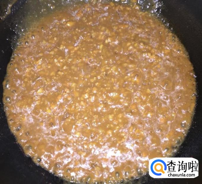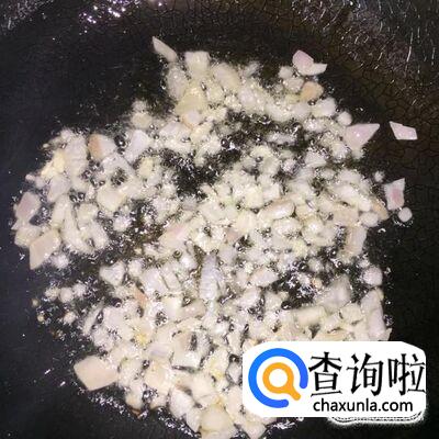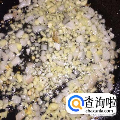 将蒜末下入锅里,一起翻炒;炒出香味;
