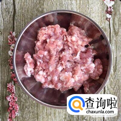 将肉末加入适量的料酒拌匀,腌制十分钟;