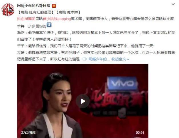 鹿晗在《热血街舞团》首次挑战popping可谓是又帅出了新高度,这次的表演如果只能用一个字来形容那绝对是“秀”。节目播出当晚,粉丝就不断刷屏高呼魔术鹿帅爆了,大家表示这次真的是被鹿晗感动到了。