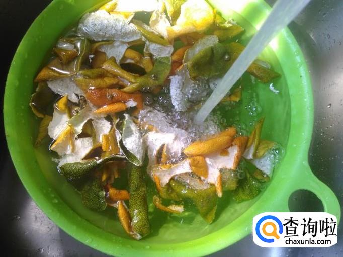 捞上来把果蒂去掉,再把橘子皮撕成小片。
