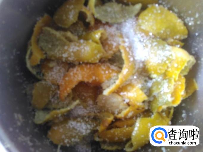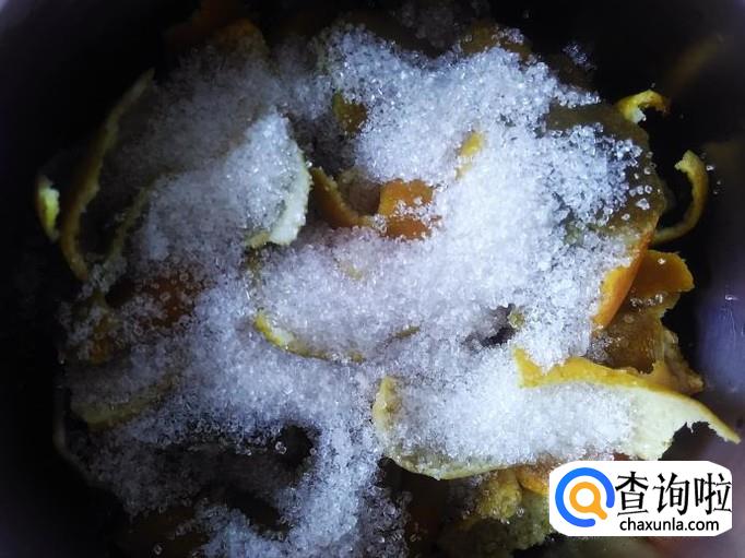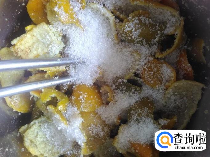 把沥干水份的橘子皮放置瓶子里,然后加50克的白糖进去搅拌均匀。