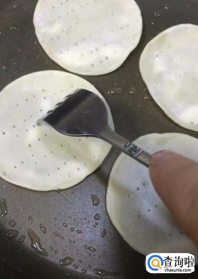 油热以后放上饺子皮,用叉子叉上小孔,然后在饺子皮上面刷一层披萨酱