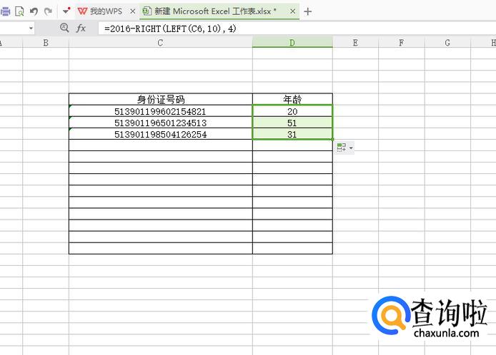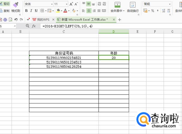 我们都知道,身份证年份在第九位开始的,如图我们身份证序列在C5,我们输入公式D6=2019-RIGHT(LEFT(C6,10),4)得到下图=。(由于目前是2019年,所以输入的是2019)