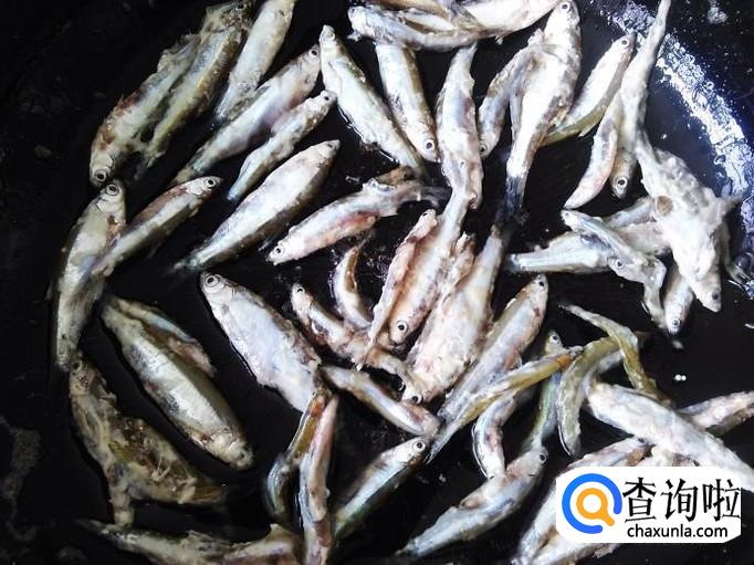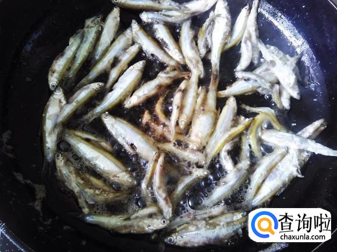 热锅下油,把小鱼均匀地摆到锅里用小火煎。