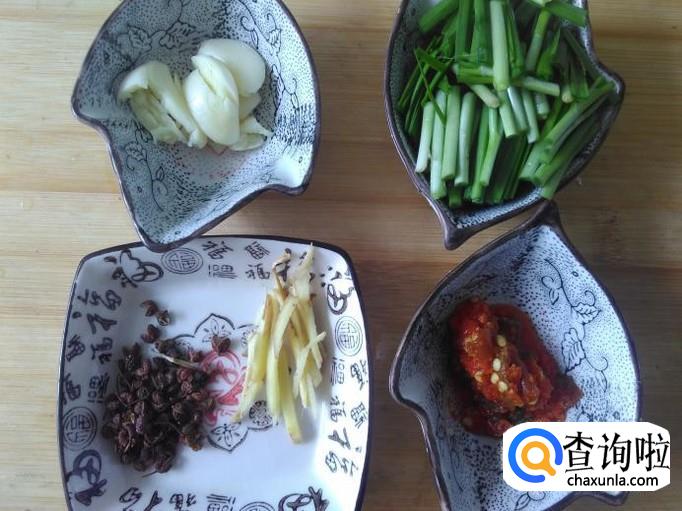 蒜米、韭菜、花椒、姜丝、辣椒酱准备好。