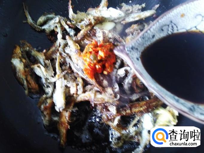 然后小鱼回锅,加1勺辣椒酱、1勺生抽。