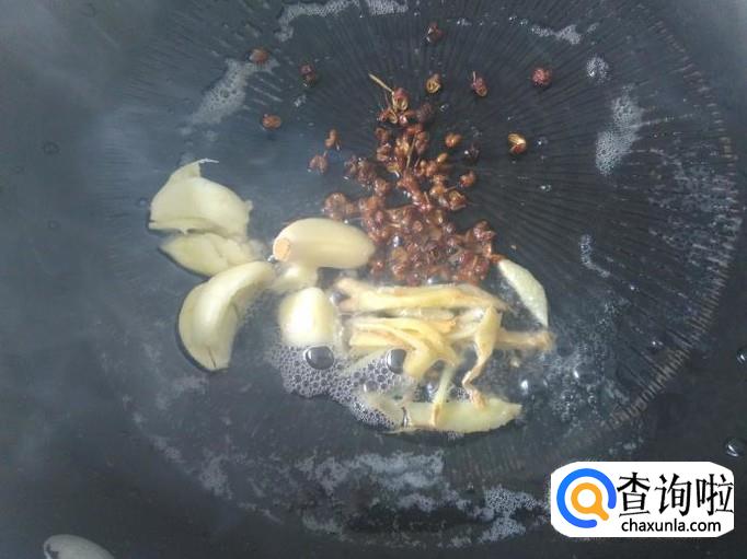 再开火下油,放花椒、蒜米、姜丝进去爆出味来。