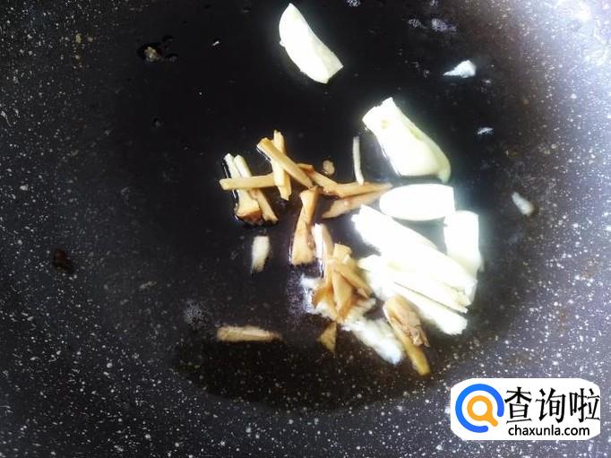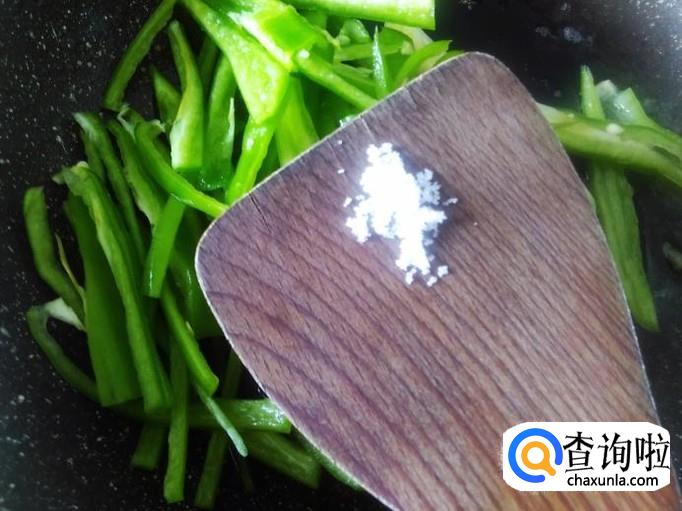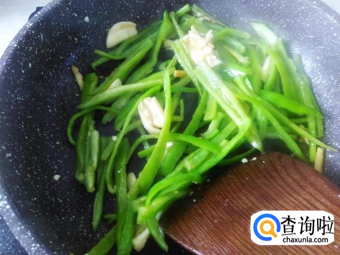再开火下油,放姜丝,蒜米进去爆出味来,然后放青椒进去加适量的盐。