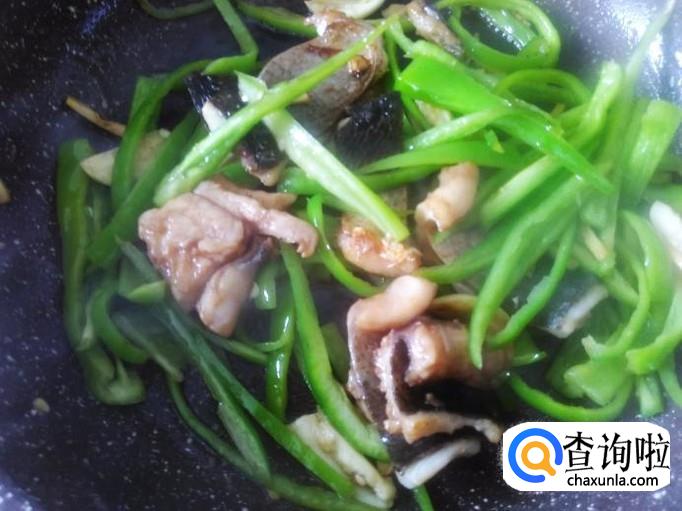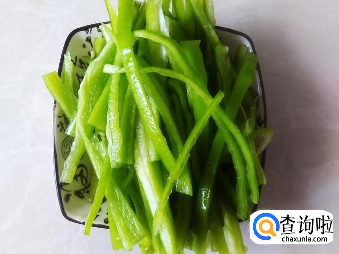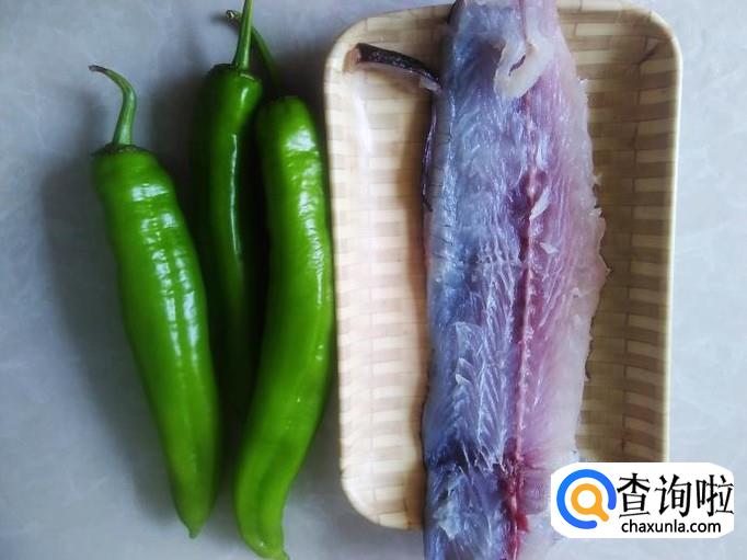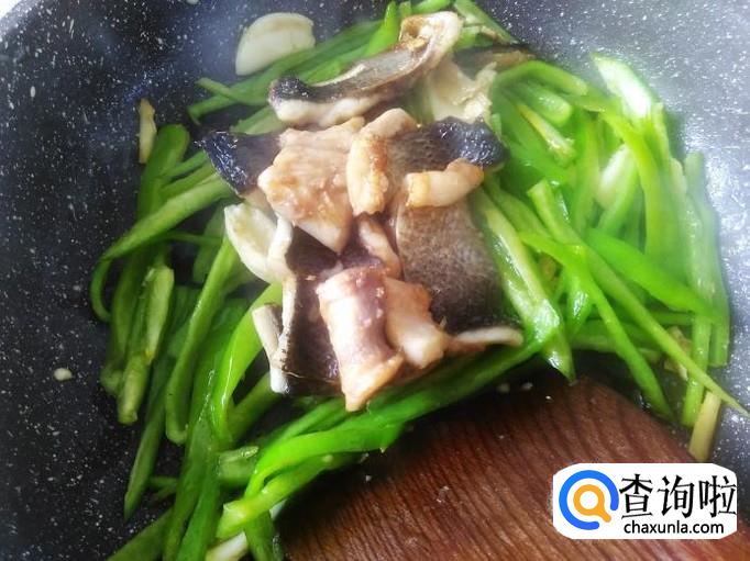 青椒3个,鱼皮150克,姜丝、蒜米、生抽、料酒适量。