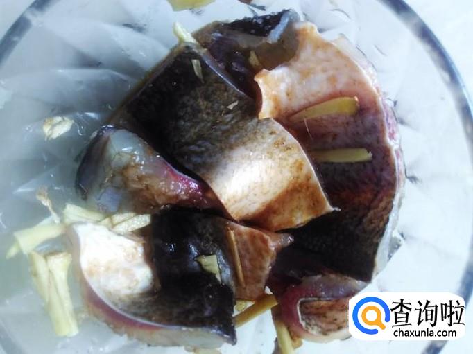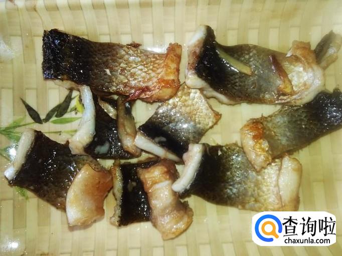 把鱼皮切成一段段,加适量的盐、姜丝、生抽、料酒腌制几分钟。