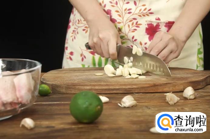 将蒜和柠檬叶都切成末状,放入盛鸡翅的碗中。