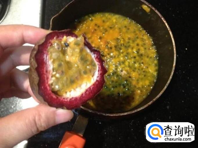 将百香果果肉用勺子舀出,舀在锅中,如下图所示,慢火熬制,不断搅拌,直到其变得浓稠,然后我们向其中加入蜂蜜,搅拌均匀,关火
