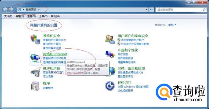 如图所示,唤出"控制面板"程序窗口。点击"网络和Internet"项,用户可根据自己的喜好和需要对系统进行设置。