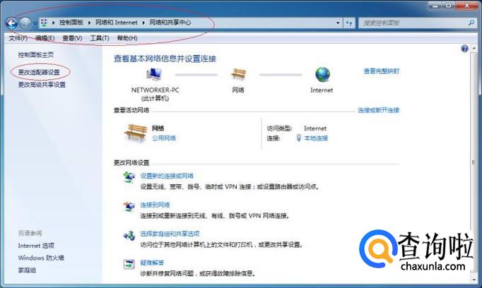 如图所示,唤出"网络和共享中心"选项界面。点击左侧"更改适配器设置"项,下步将进行设置禁用或启用本地连接的操作。