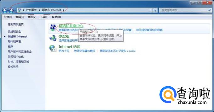唤出"网络和Internet"选项界面,如图所示。点击右侧"网络和共享中心"项,用于查看网络状态、更改网络设置。
