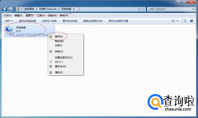 唤出"网络连接"选项界面,如图所示。鼠标右击"本地连接"图标,弹出快捷菜单选择"禁用"项。