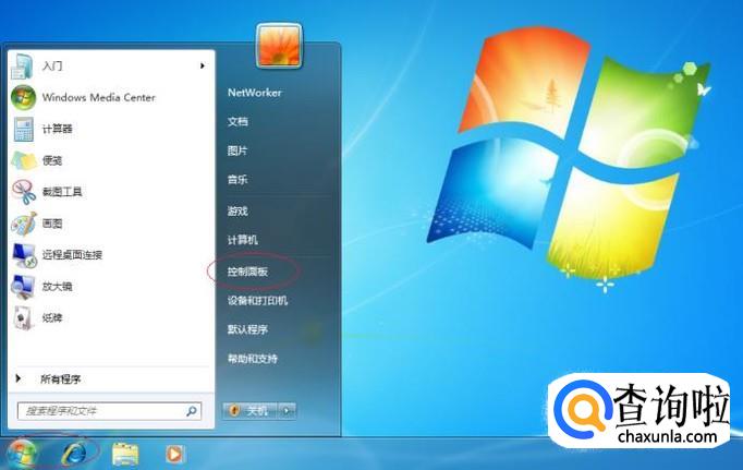 启动Windows 7操作系统,如图所示。点击任务栏"开始"按钮,弹出开始菜单选择"控制面板"项。