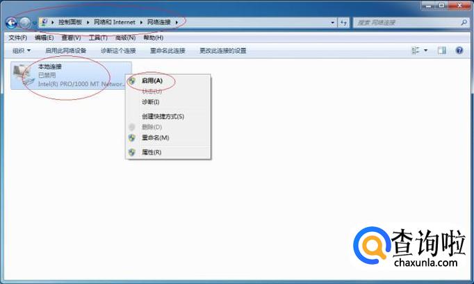 如图所示,完成禁用本地连接的操作。鼠标右击"本地连接"图标,弹出快捷菜单选择"启用"项。