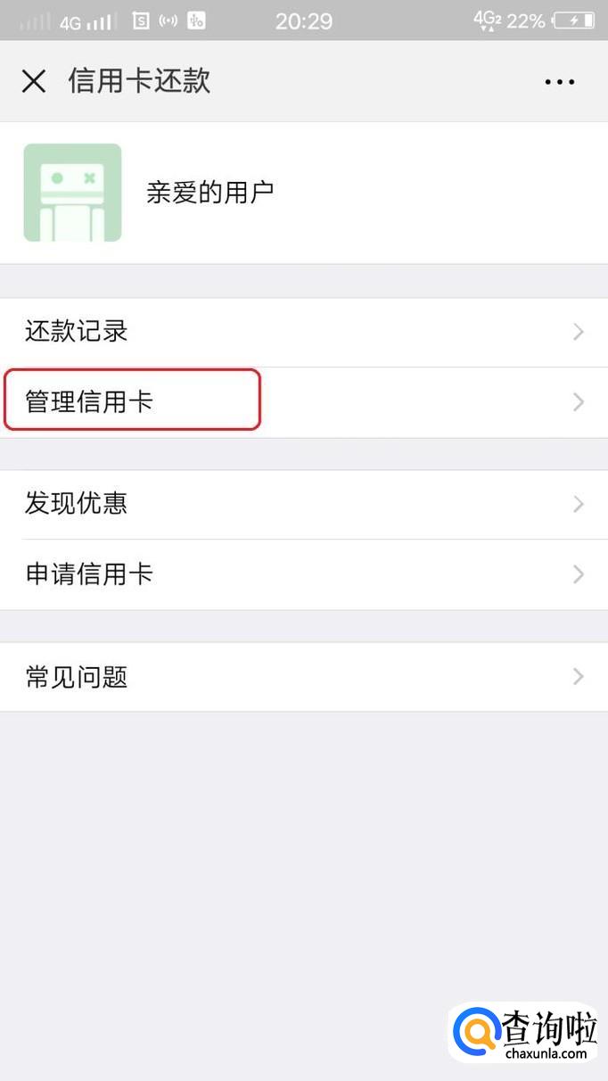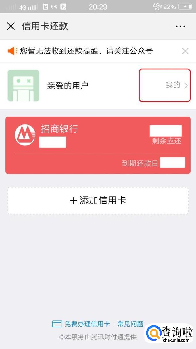 添加完成之后,信用卡还款变成如下界面,我们点击图中标记处“我的”。
