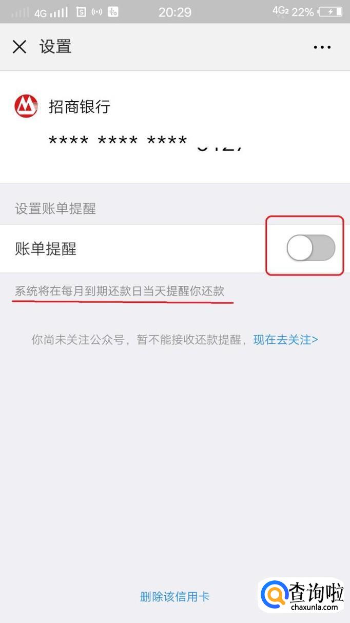 点击“管理信用卡”,然后点击刚才绑定的信用卡,就可以设置“账单提醒”了,如图所示。到了还款日,微信就会提醒您及时还款了。