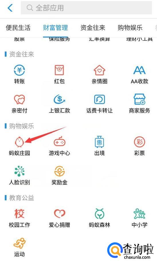 点击更多之后会进入到如图所示面板,此时我们将面板下拉,直到找到“购物娱乐”模块里面的“蚂蚁庄园”,找到之后单击该按钮。