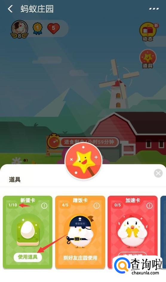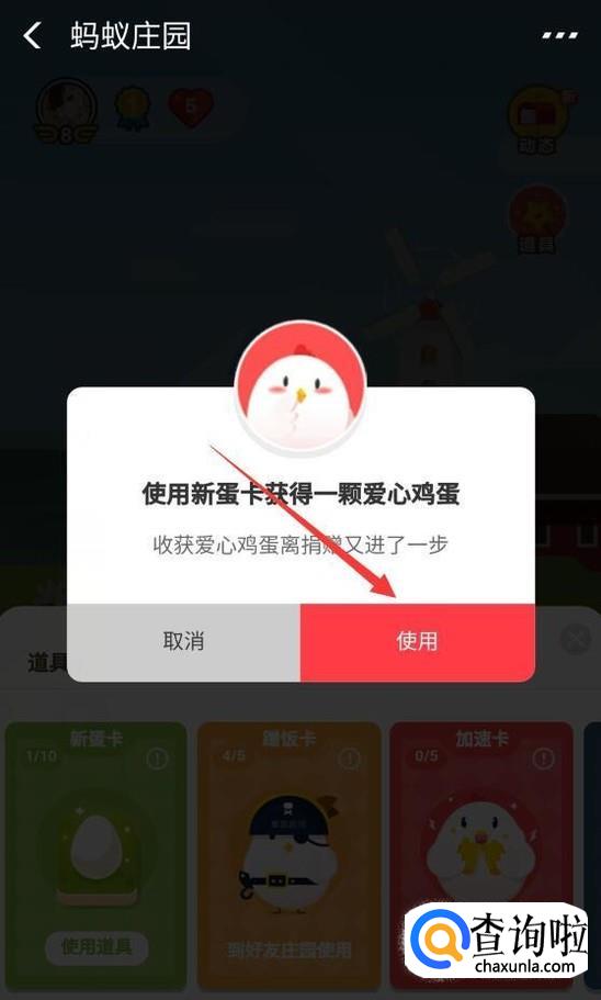 单击道具按钮后在底部会弹出一个对话框,此时会显示我们所获得的道具,其中就有一个“新蛋卡”,如果有获得这个道具的话,他会显示你获得的该道具的数量,此时我们可以看到数量是1,所以可以使用一次,我们单击“使用道具”按钮。