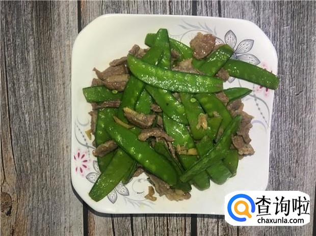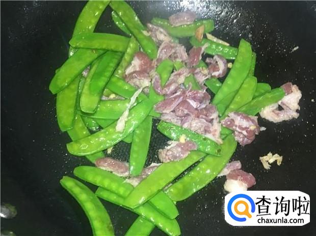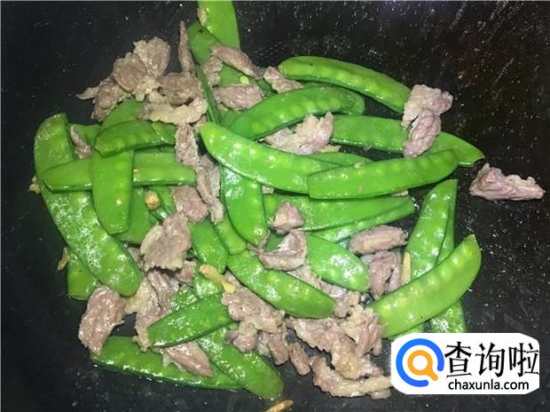 把荷兰豆炒两分钟,变颜色后,即可倒入腌制好的牛肉,牛肉不要炒太久,炒太久就不嫩了。倒入牛肉后,加入适量的盐,大火翻炒5分钟,即可关火。