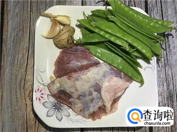 把食材准备好,牛肉一大块、荷兰豆适量、姜适量、蒜头两瓣。