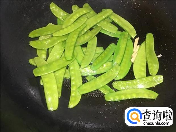 热锅下油,放入蒜头煸香,然后把荷兰豆倒入锅中,大火翻炒。