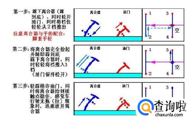 起步后,车进入正常行驶路线时,立即踩踏加速踏板,将车速迅速提高到比此档高一个档位的低速范围(就是:变速杆换入高一档位,在离合器抬起后加油时,发动机和车辆不抖动就正合适,如果发动机和车辆出现抖动现象,说明提速偏低,应将车速再提高一些,如果在离合器抬起后,车辆出现后坐现象,说明提速偏高,会浪费燃油,加速发动机磨损,应少提些。要想达到正合适的水平,就需要多体会什么速度是2档的低速范围,什么速度是3档的低速范围。 - 05