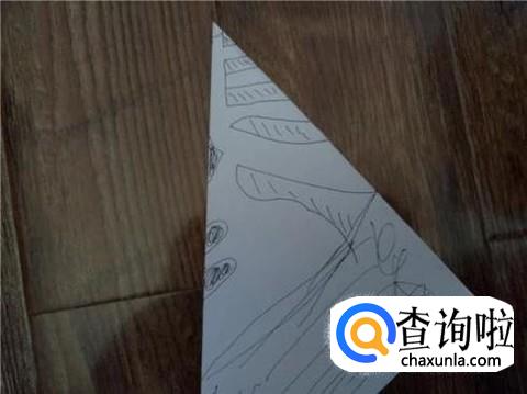 之后我们在折叠的三角形纸上,画出如图所示的图案,就是心形春字的一半,可以将需要剪刀的地方涂抹上阴影,如图所示。