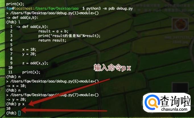 在终端里输入小写字母p x,p就是英文单词print的缩写,意思就是打印变量x的值。