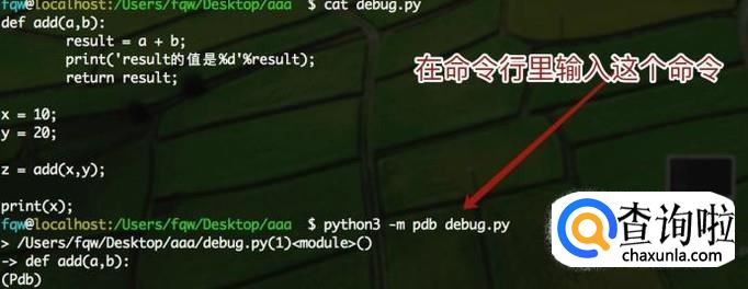 我这里用的python3的环境,在终端里输入如图显示python3 -m pdb debug.py命令。就是就是用python的pdb模块调试debug.py文件代码。