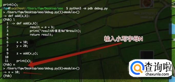 在终端里输入小写字母n,就是英文单词next的缩写,意思就是执行下一行代码。