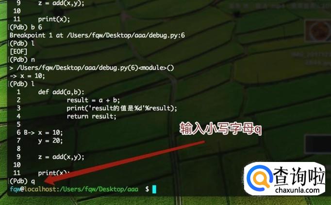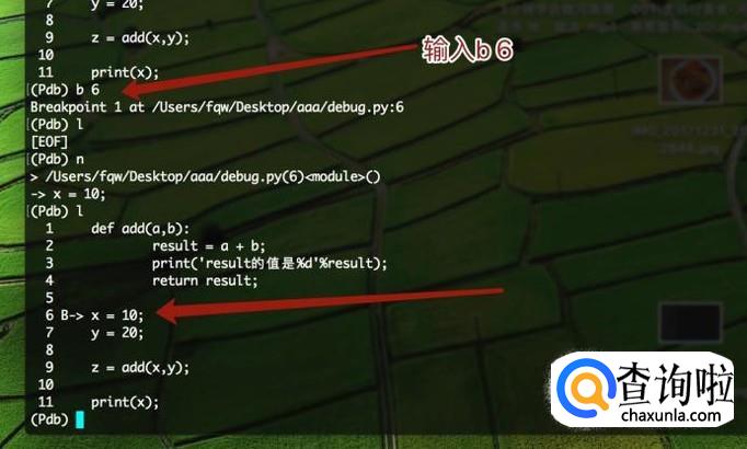 在终端里输入小写字母b和阿拉伯数字6,b就是英文单词break的缩写,意思就是在第6行代码打个断点。