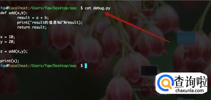 首先打开电脑后,打开终端,我这里以调试debug.py文件做说明,简单介绍python的pdb调试。为了演示,先用cat命令查看一下debug.py的内容。