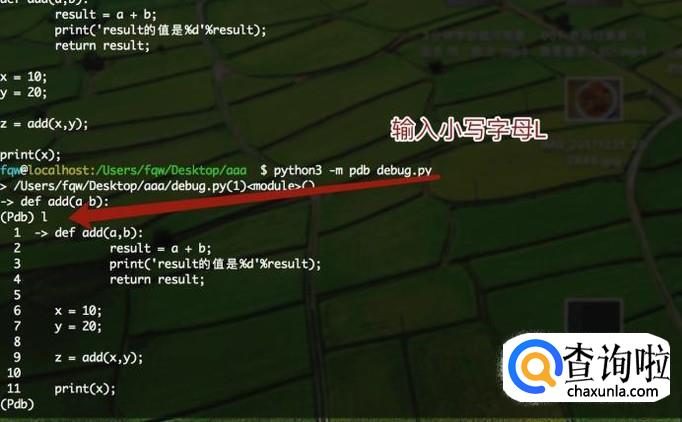 进入调试后,在终端里输入小写字母l,就是英文单词list的缩写,意思就是列出代码内容。如果显示。