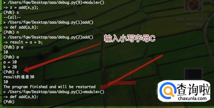 在终端里输入小写字母c,就是英文单词continue的缩写,意思就是继续执行代码一直结束,然后重新进入调试。