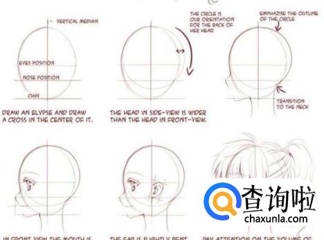 1.先确定头型,然后确实正面和正侧面特点的形状,方便之后画脸型。