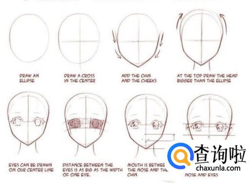 3.鼻子、嘴、耳朵,视线会让鼻中线的交点就是鼻子的起始点,呈折线型,不用太出去,适当就行了,嘴巴的弧度是和鼻中线两侧的长度还有脸部长度有关。