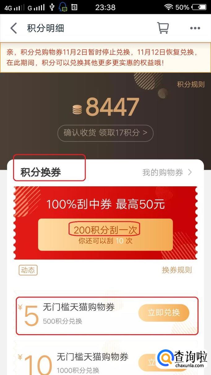 我们进入的是积分明细页,可以看到你当前账户的积分值,并可以看到积分的用处,200积分可以刮券,最高50元代金券(满减)。另外,用积分也可以兑换普通购物券,比如500积分换一张5元无门槛购物券(最高30元)。