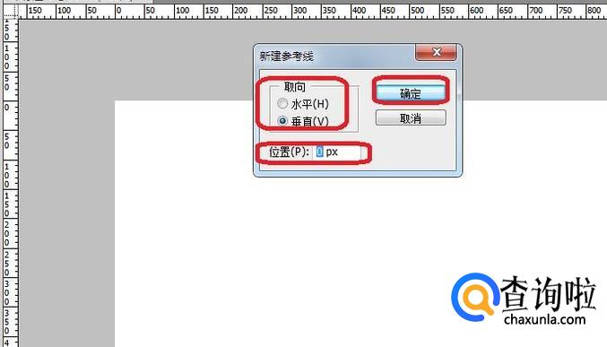 出现“新建参考线”面板,我们根据需要,设置参考线“水平”或者“垂直”,然后对照标尺,输入像素值,点击确定即可。