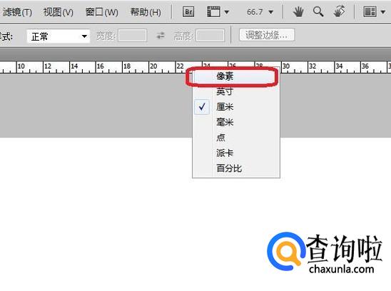 要调出比较精确的辅助线,我们需要修改一下标尺单位,如图所示,右键单击标尺,弹出菜单,我们把单位改为“像素”。