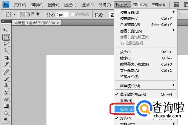 首先,我们打开PS,新建一个图层,然后点击“视图”,“标尺”。