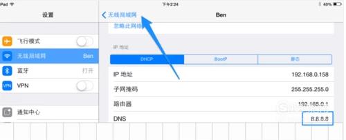 接下来请删除原来的 DNS 地址,输入新的 8.8.8.8 地址并点击“无线局域网”按钮返回。