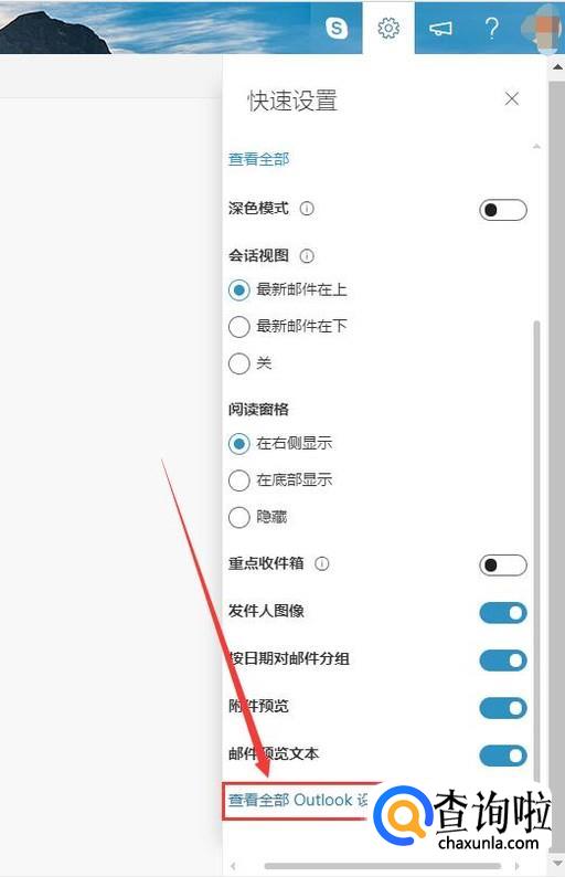 在快捷设置弹窗拉到最下面,点击“查看全部Outlook设置”。