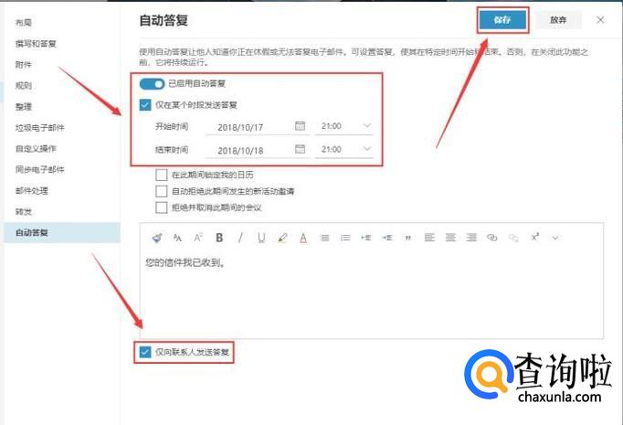 如图,选中“开启自动回复”,可以设置回复的时段,或是“仅向联系人发送答复”,点击保存,自动回复就被设置成功了。