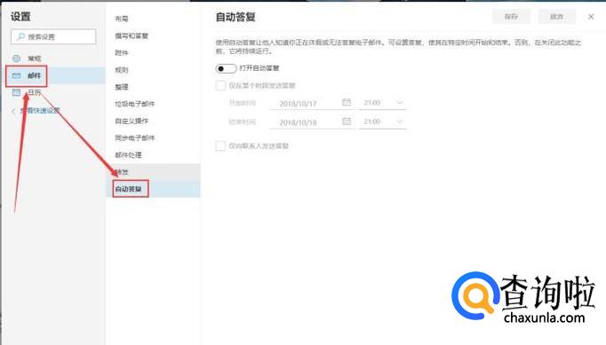 在侧边栏选中“邮件”,然后选择“自动回复”。
