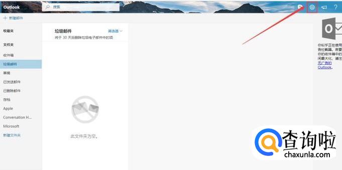 登陆Outlook邮箱,点击右上角的齿轮按钮,进入设置。
