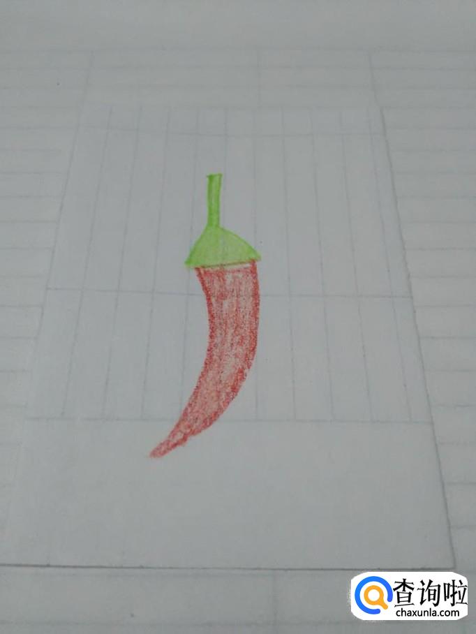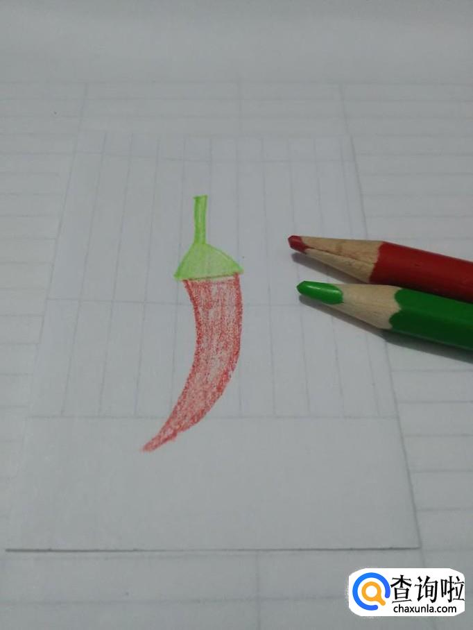 最后用绿色涂果柄和果蒂,用红色涂辣椒,尖辣椒就画完了。